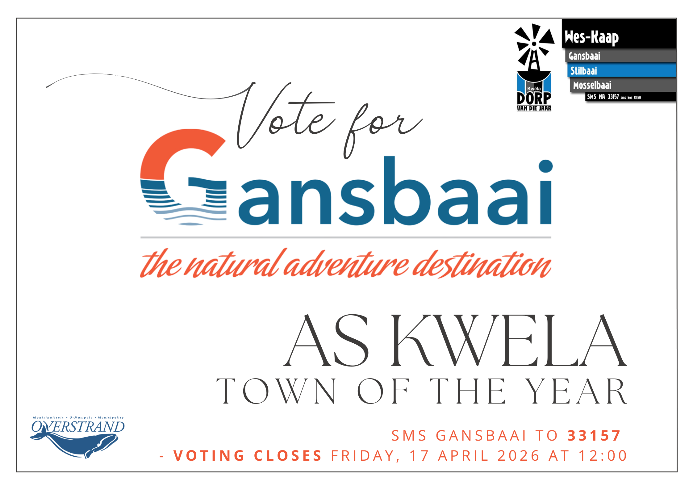 Save “Kwela” as a contact on your phone. During the voting period, SMS GANSBAAI to 33157 at a cost of R1.50 per SMS.